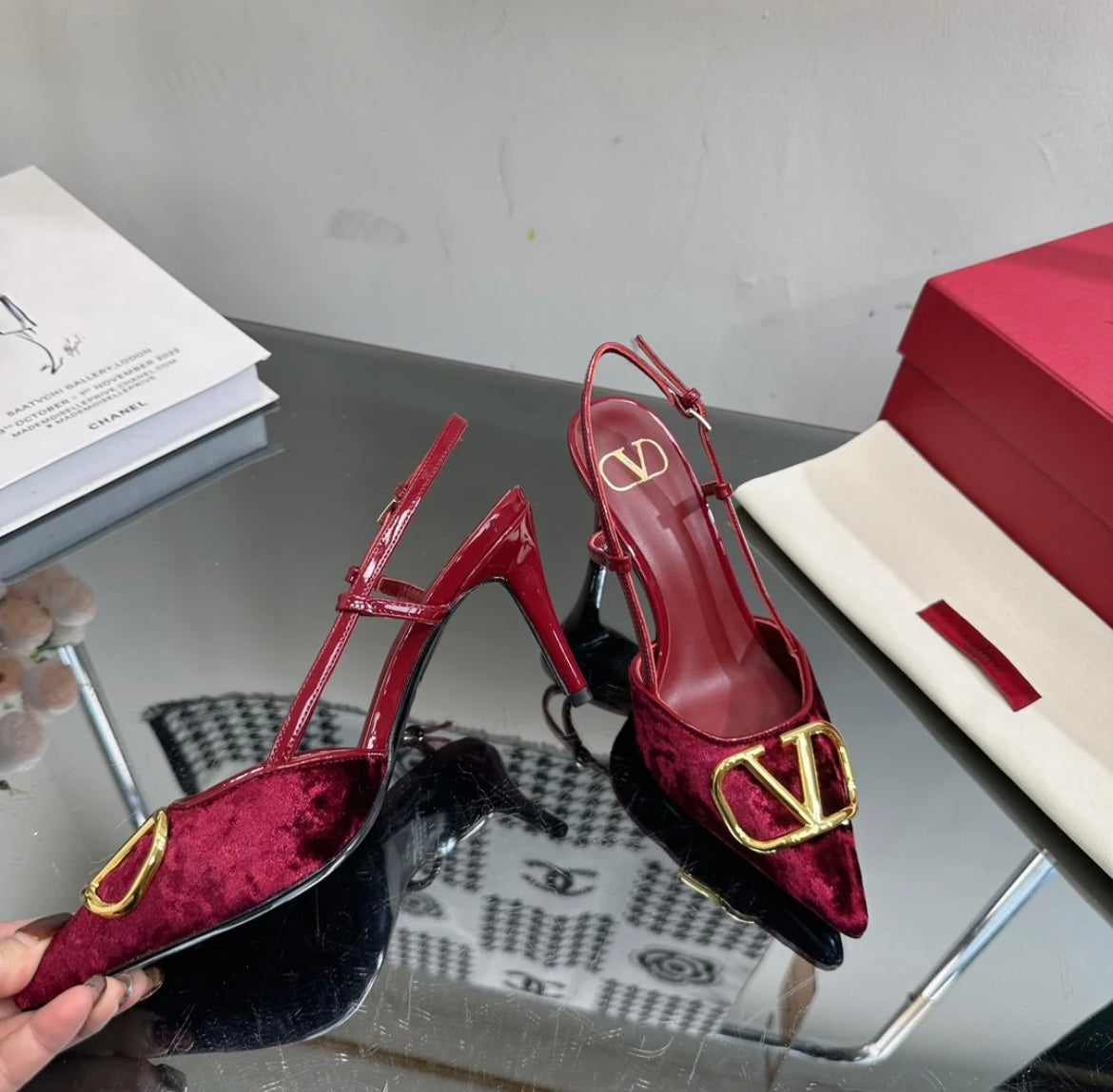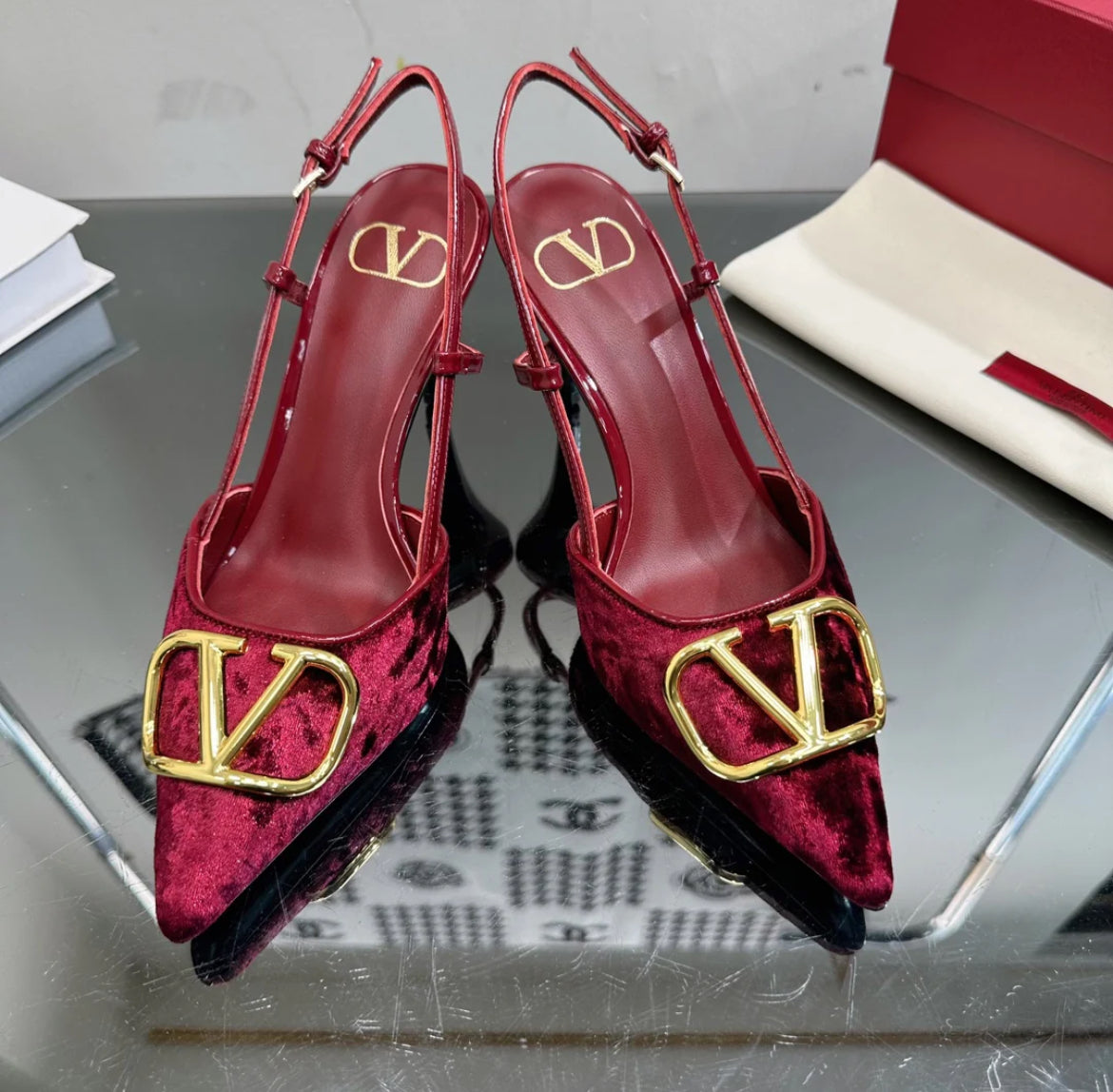 Burgundy red heels with a gold logo on the toe